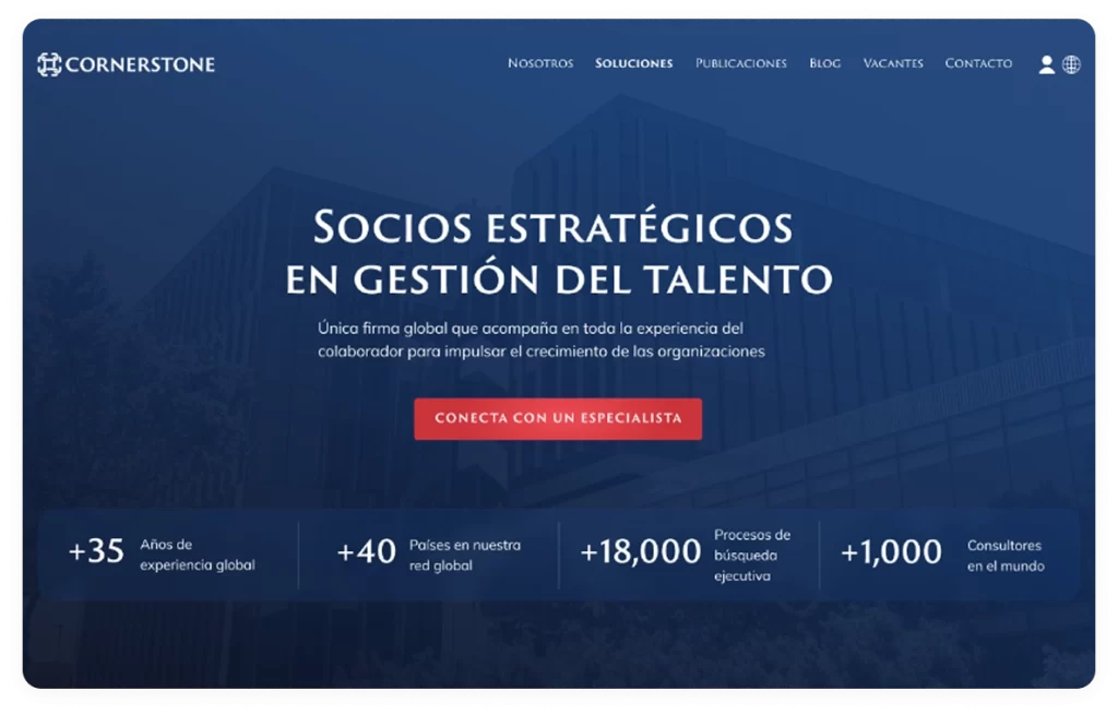 Proyecto web para Cornerstone Perú: sitio corporativo enfocado en soluciones de talento, autoridad y generación de leads.